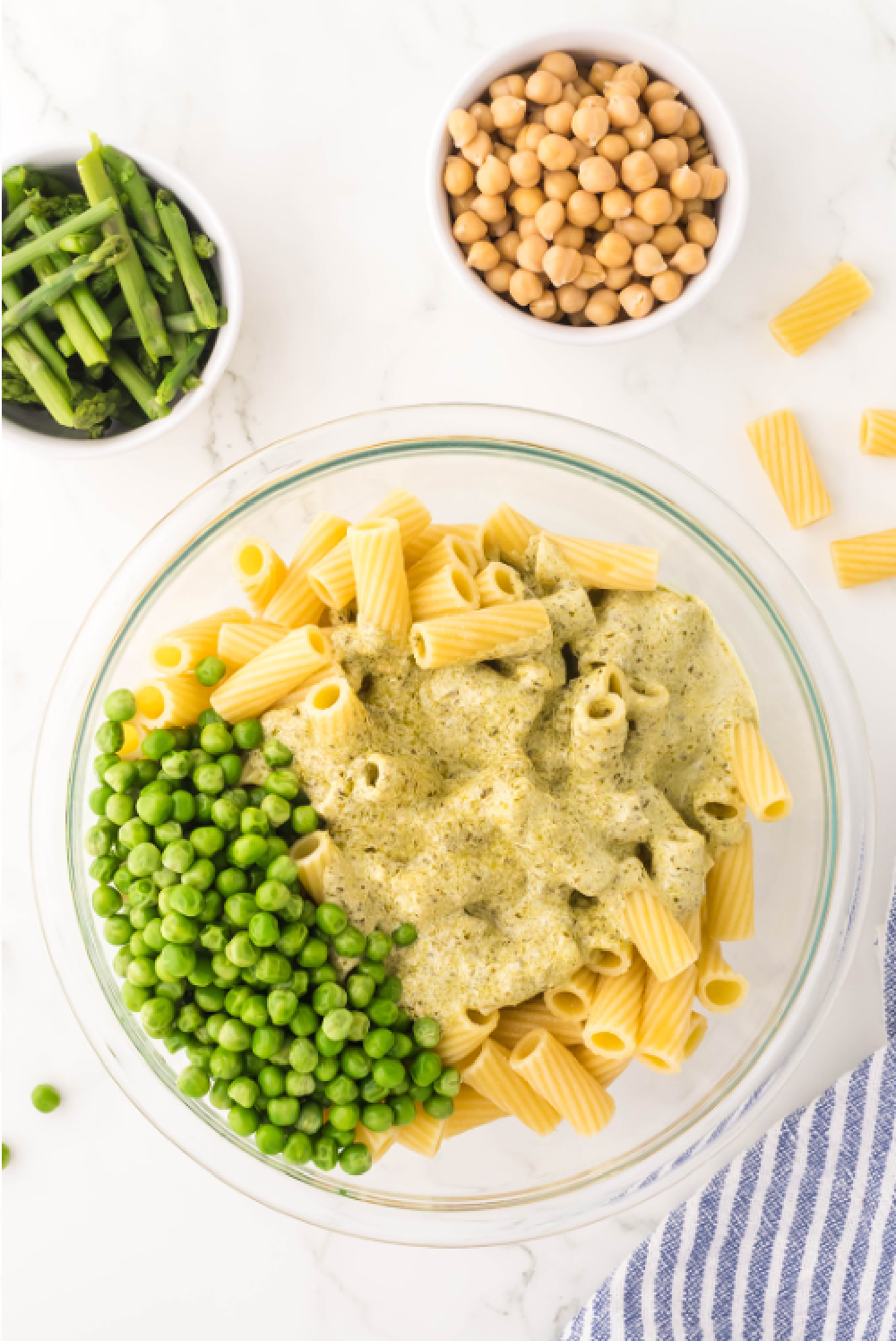 - In a large mixing bowl, combine the cooked pasta, peas, asparagus, the chickpeas, and toasted pine nuts.