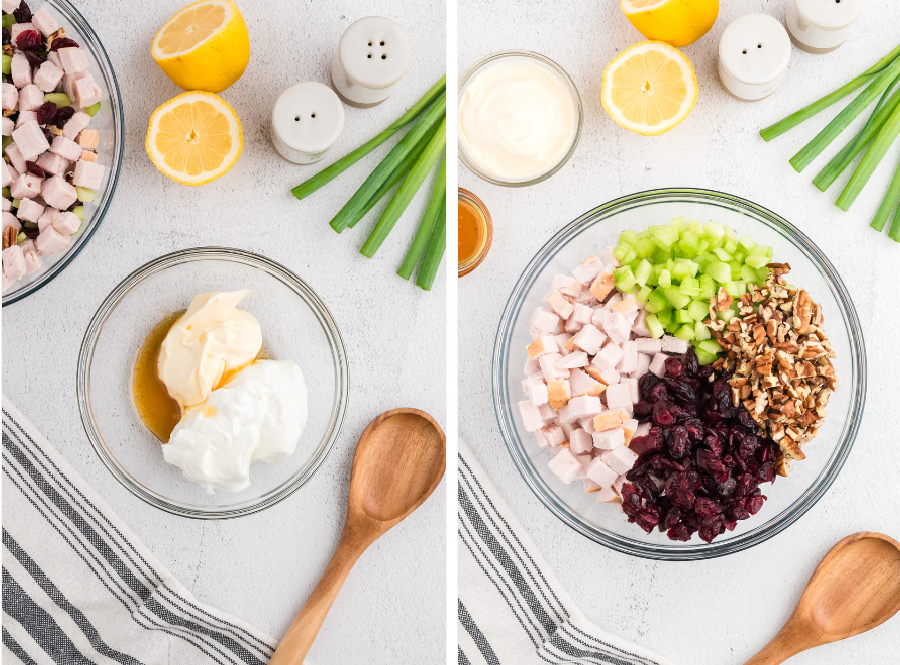 - In a separate small bowl, whisk together the Greek yogurt, mayonnaise, Dijon mustard, honey, lemon juice, salt, and pepper until smooth.