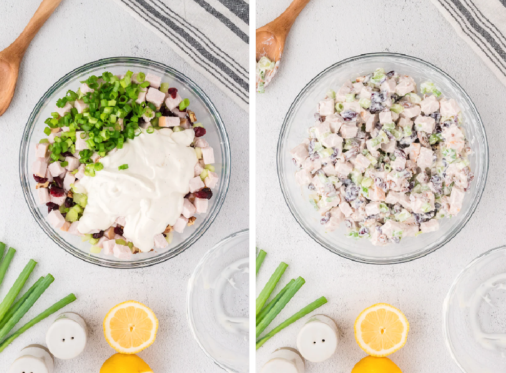 - In a large mixing bowl, combine the diced chicken, scallions, red grapes, craisins, celery, red onion, and pecans.