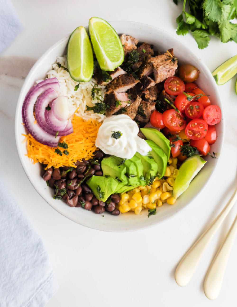 - Sides – Rice is a staple in a burrito bowl and I have a fantastic recipe that entails baking it. It’s foolproof! You can also add beans, tomatoes, avocado, cheese, salsa. It’s totally up to you.